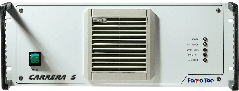 The Carrera series of power supplies uses primary switched mode technology to offer high efficiency and fast arc detection and recovery in a compact unit. Based on a modular design, the Carrera can be configured for maximum outputs ranging from 3kW to 12kW.