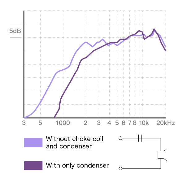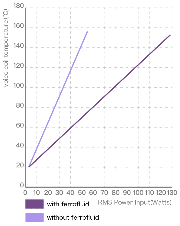 Using ferrofluid increases heat transfer from the voice coil to the magnet assembly. This increases power handling and reduces failures due to thermal transients. Ferrofluid make drivers smaller for same power output. As a thermal conductor, ferrofluid is 600% more efficient than air! These materials further reduce rapid changes of impedance due to temperature change through efficient thermal control.