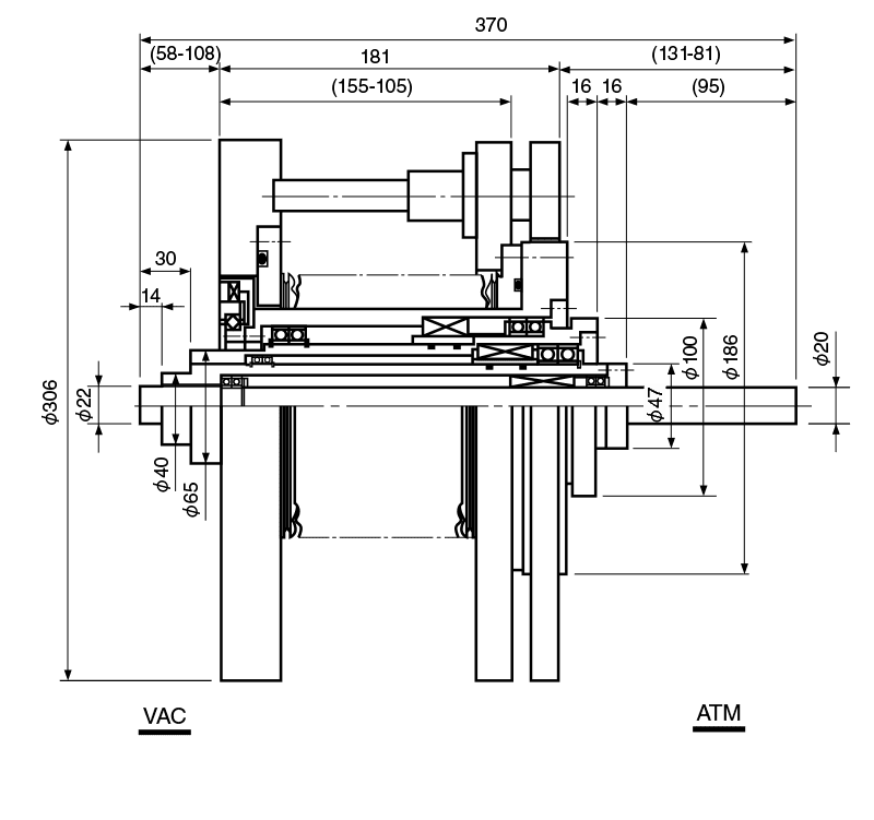 This model has a high stiffness and achieves high run-out accuracy and rotation accuracy with a co-axial/tri-axial structure. It allows for linear motion with 50mm strokes, making it best suited to cluster tools.