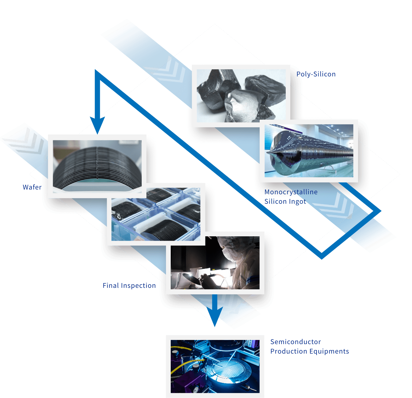 We produce small-diameter silicon wafers (12 inches or less) for semiconductors in an integrated manner ranging from single crystal ingots to wafer processing.