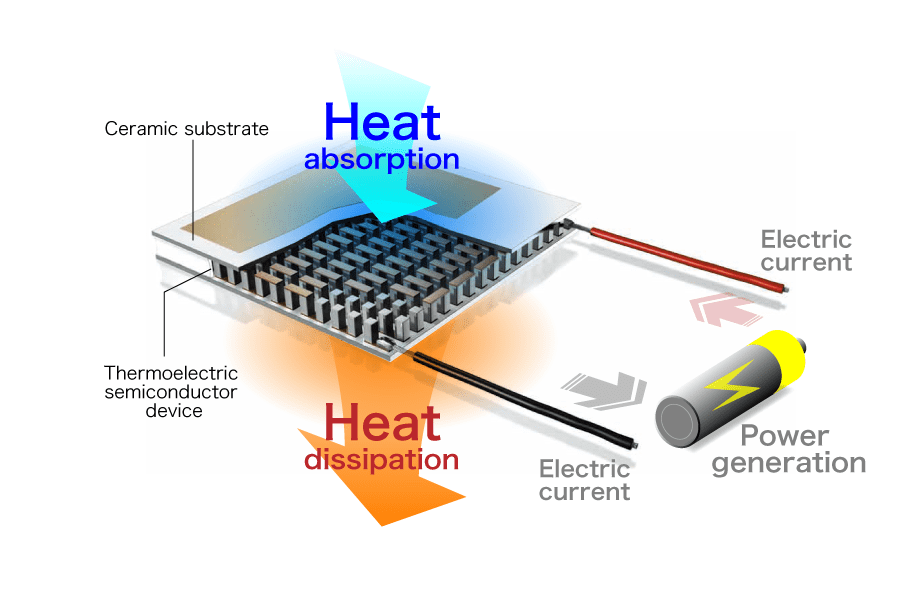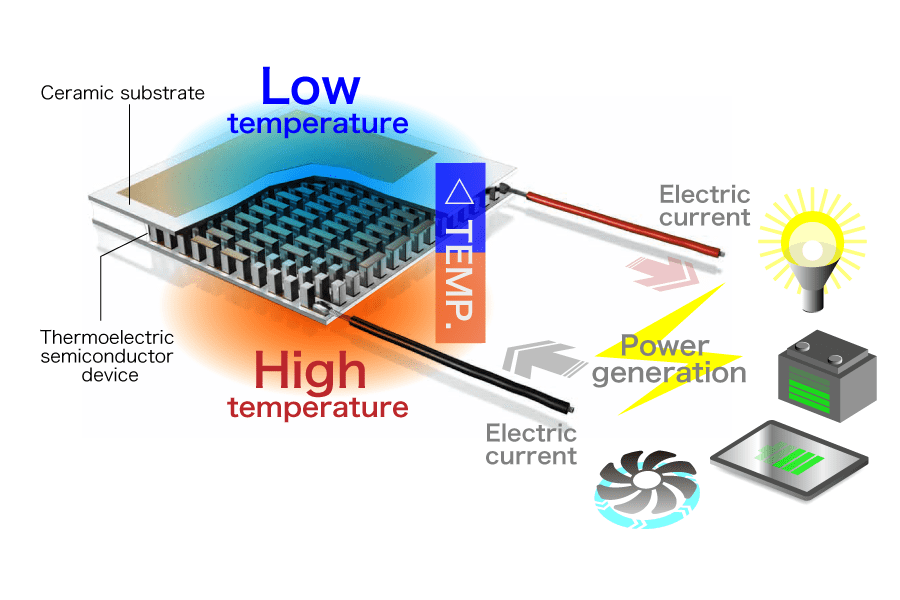 The thermo-electric module operates as a thermoelectric power generation module (Seebeck element) for energy harvesting that has been attracting attention in recent years. Since this is not a system using steam to turn the turbine like thermal and nuclear power but is direct power generation due to the temperature difference of the thermoelectric power generation module, and environmental impact is low because there is no need to burn the heat source, there is great potential in the future for its use as part of the measures for CO2 reduction.