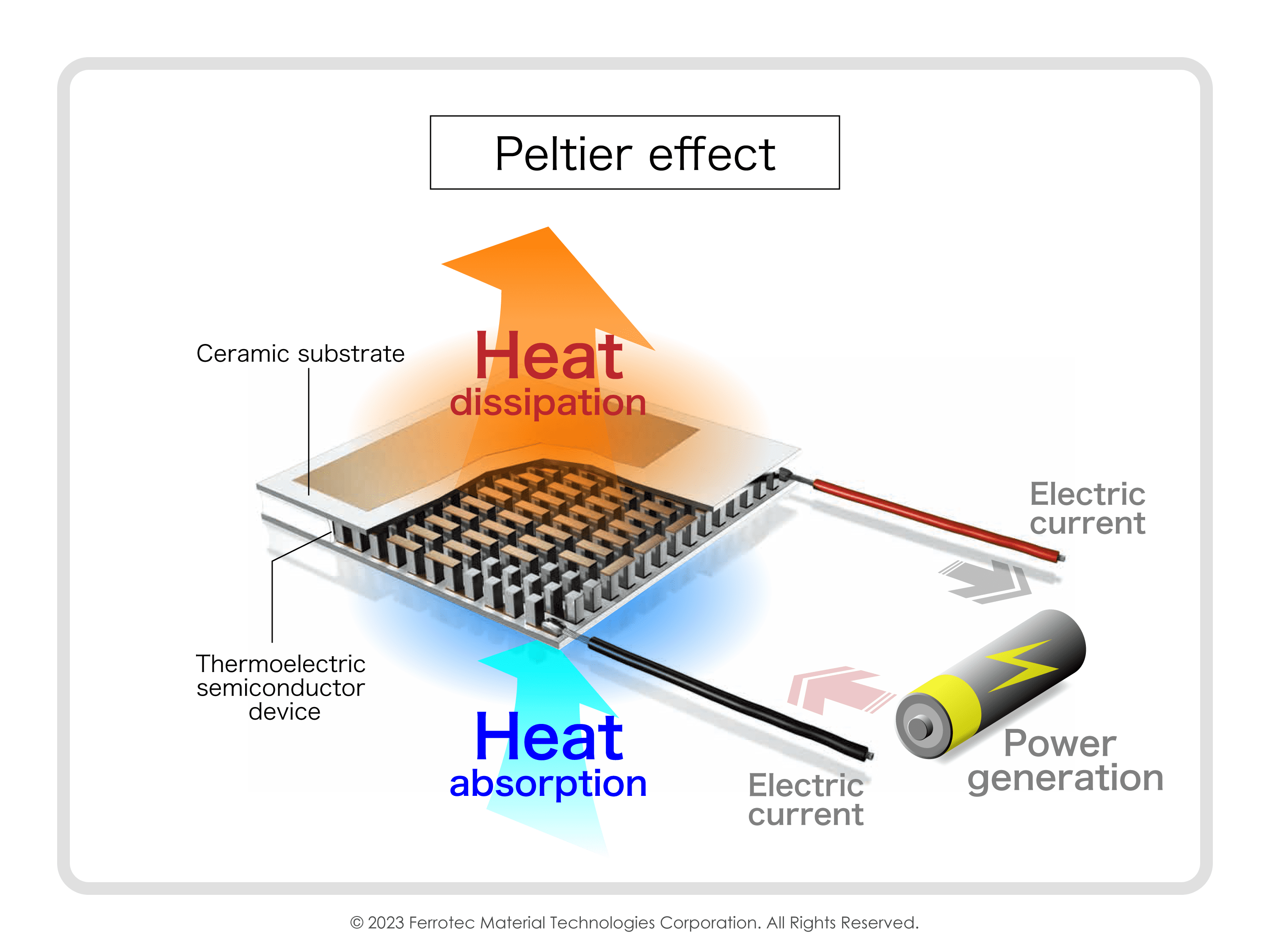 When a direct current flows, heat moves from one side of the thermo-electric module to the other. This is called the "Peltier effect". This phenomenon cools one side of the thermo-electric module and at the same time, the opposite side is heated (See Figure 1 below). Also, reversing the polarity of the DC power supply reverses this phenomenon and heat transfer occurs in the opposite direction (See Figure 2 below). Accordingly, the thermo-electric module can be used for both cooling and heating purposes depending on usage conditions. Precise temperature control will be possible by use in combination with sensors and controllers according to its function.