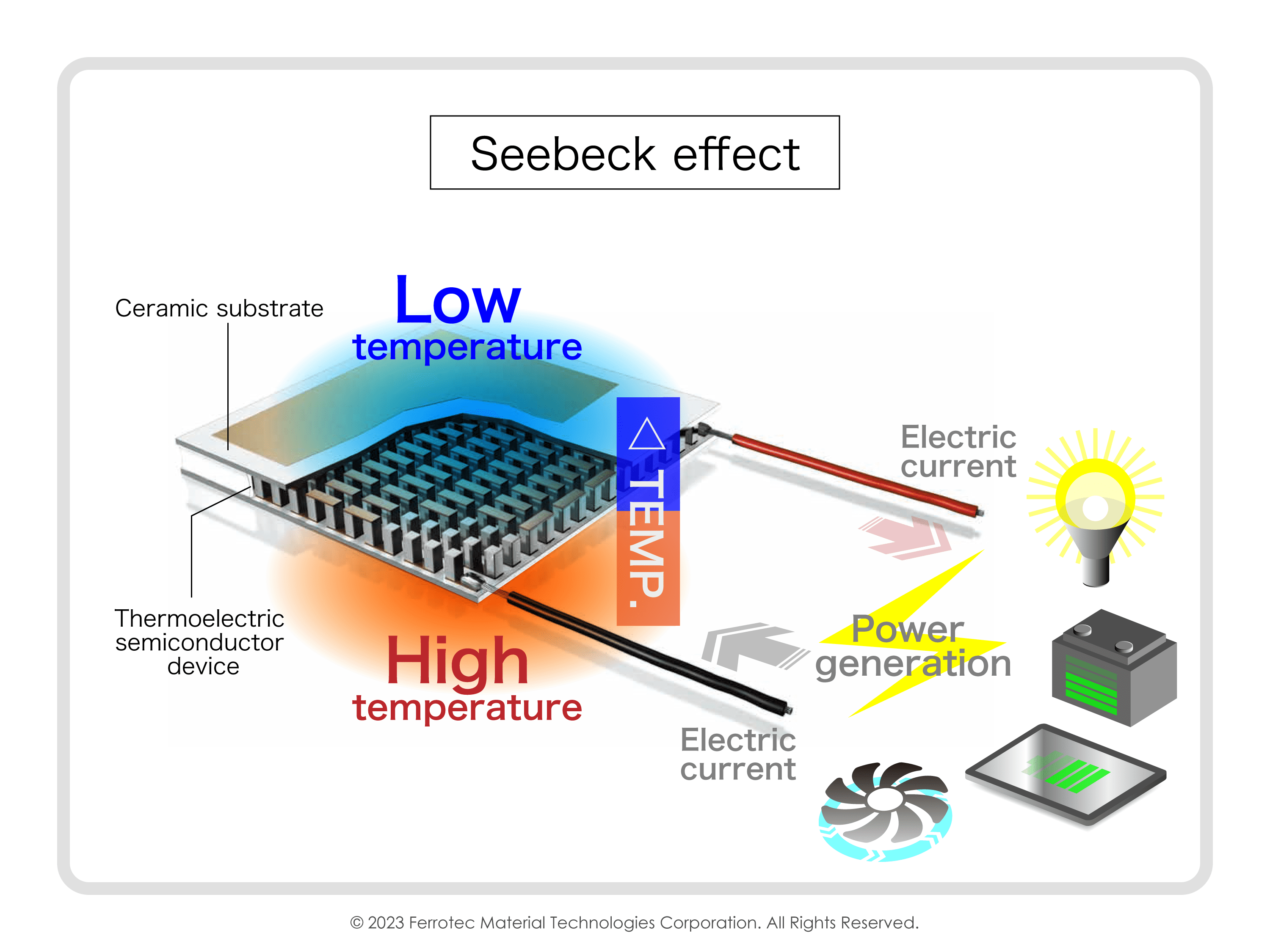 Also, the fact that it is possible to take out electricity by adding a temperature difference to the front and back side of the thermo-electric module is called the "Seebeck effect" (See Figure 3 below). The greater the temperature difference, the greater the amount of electricity generated.