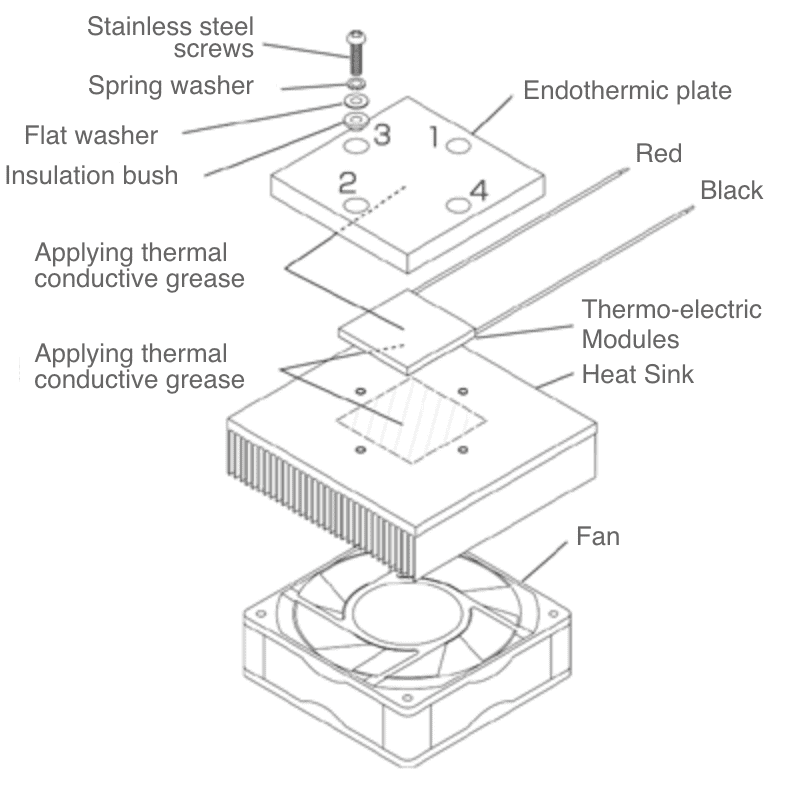 2.Apply heat conductive grease thinly and evenly on the hot side of the thermo-electric module, and mount it onto the heat sink, as shown in Figure 2. Move the module back and forth and around while pressing with an even force to remove the residual layer of air.