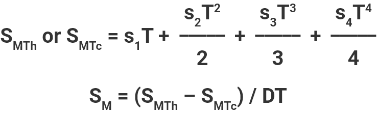 The above polynomial expression represent the Seebeck coefficient when the temperature difference across the module is zero (DT = Th – Tc = 0). When DT>0, the Seebeck coefficient must be evaluated at both temperatures Th and Tc using the expressions: