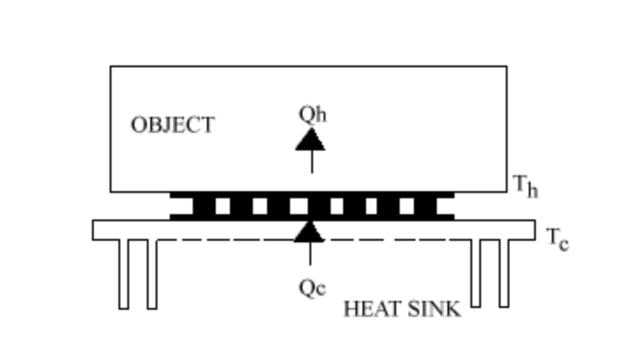 11.7 MODELING OF COMPLETE THERMOELECTRIC COOLING SYSTEMS: Information presented in the foregoing paragraphs describes the mathematical modeling of thermoelectric modules as opposed to complete thermal systems. By incorporating the module calculations into a more sophisticated system model, it is possible to accurately simulate the overall thermal performance. Two heat leak sources that must not be overlooked in a complete thermal model include (a) heat conduction between the cooled object and heat sink, and, (b) heat conduction through clamping screws, if any, that physically connect the heat sink and cooled object.