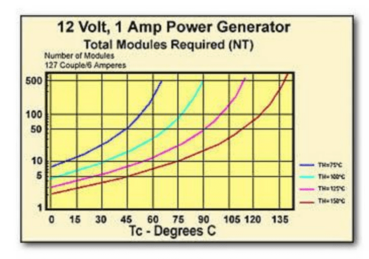 For any thermoelectric generator design it is always desirable to maximize the applied temperature differential in order to minimize the total number of modules in the system. This situation can be clearly seen in Figure (13.3). Module requirements for a typical 12-volt, 1-ampere power generator are plotted at several fixed values of Th based on the use of 127-couple 6-ampere TE modules. From this graph, it is evident that a very large number of modules is needed when the cold side temperature (Tc) is high and the temperature differential, therefore, is small. Performance of the cold-side heat sink is of the utmost importance and its thermal resistance must be extremely low. In many cases, cold-side heat sink design will prove to be the most challenging engineering problem.