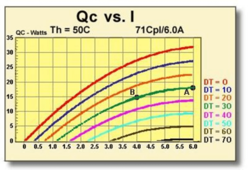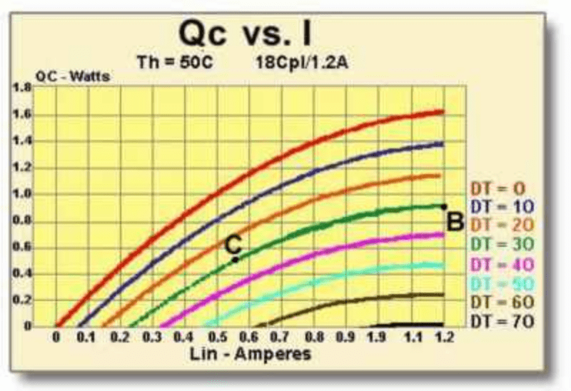 It is necessary first to determine whether a single 71-couple, 6-ampere module is capable of providing sufficient heat removal to meet application requirements. We locate the DT=30 line and find that the maximum Qc value occurs at point A and with an input current of 6 amperes. By extending a line from point A to the left y-axis, we can see that the module is capable of pumping approximately 18 watts while maintaining a Tc of 20°C. Since this Qc is slightly higher than necessary, we follow the DT=30 line downward until we reach a position (point B) that corresponds to a Qc of 15 watts. Point B is the operating point that satisfies our thermal requirements. By extending a line downward from point B to the x-axis, we find that the proper input current is 4.0 amperes.