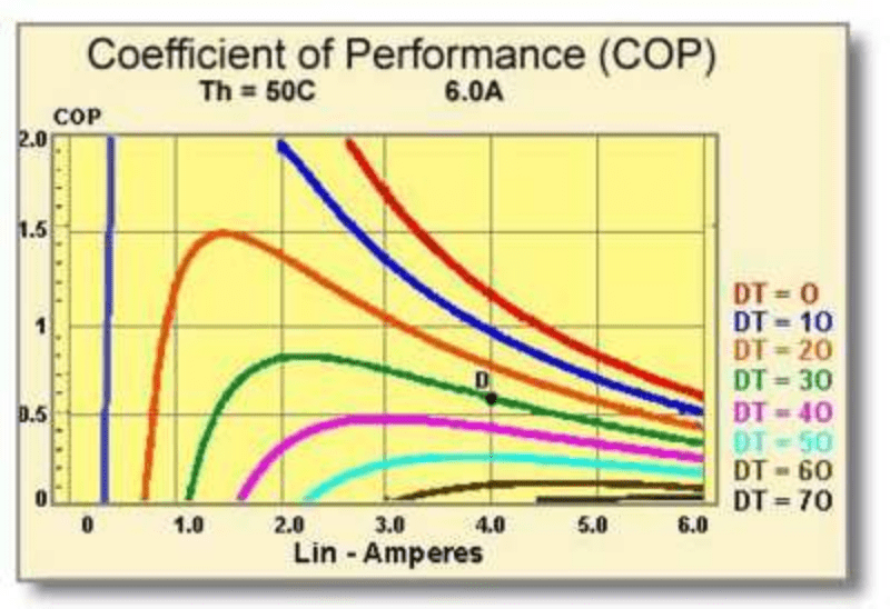 We locate the DT=30 line and, at the 4.0 ampere intersection, mark point D. By extending a line from point D to the left y-axis, we can see that the module’s coefficient of performance is approximately 0.58.