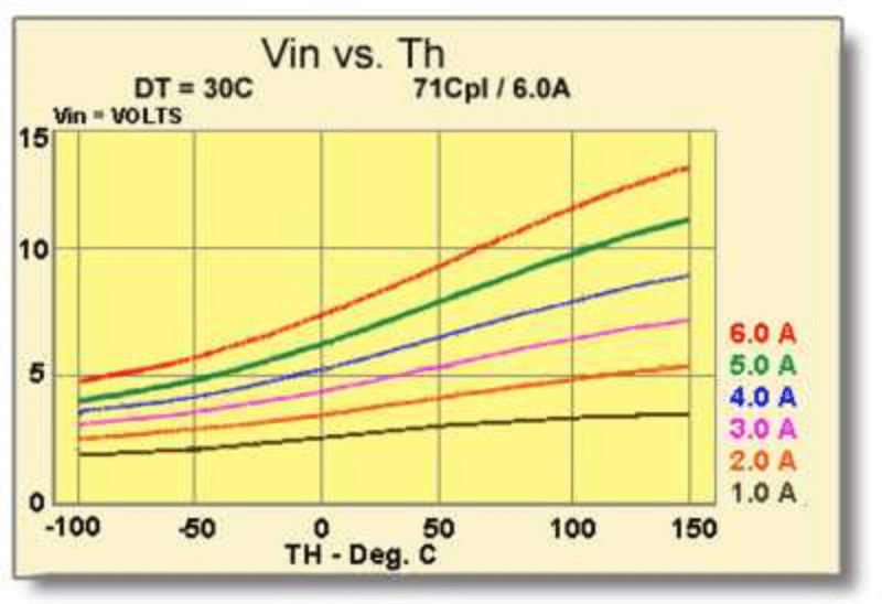9.4 An additional graph of Vin vs. Th, of the type shown in Figure (9.4), relates a module’s input voltage (Vin) and input current (I) as a function of module hot side temperature (Th). Due to the Seebeck effect, input voltage at a given value of I and Th is lowest when DT=O and highest when DT is at its maximum point. Consequently, the graph of Vin vs. Th usually is presented for a DT=30 condition in order to provide the average value of Vin.